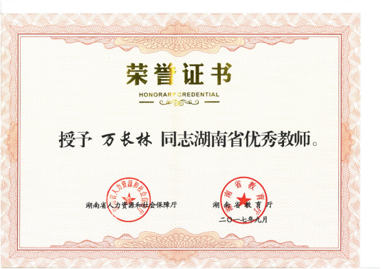 近日,从湖南省人力资源社会保障厅、教育厅传来喜讯,公司beats365官方网站经理万长林教授获得“湖南省优秀教师”荣誉称号。根据省人力资源和社会保障厅、省教育厅《关于评选表彰“湖南省优秀教师”、“湖南省优秀教育工作者”和第八届 “湖南省徐特立教育奖”获得者的通知》(湘人社函〔2017〕210号)要求,经过自下而上层层推荐、审核、评审,并经湖南省优秀教师优秀教育工作者和第八届“湖南省徐特立教育奖”获得者评选表彰工作领导小组研究审定。