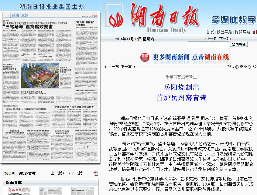 近段时间以来,先后有新华网、湖南教育网、华声在线、新湖南、岳阳日报、长江信息报等媒体聚焦公司岳州窑陶瓷文化传承与发展协同创新中心,对岳州窑青瓷研发成果在京通过专家鉴定、烧制的首炉岳州青瓷出炉等内容进行了报道。