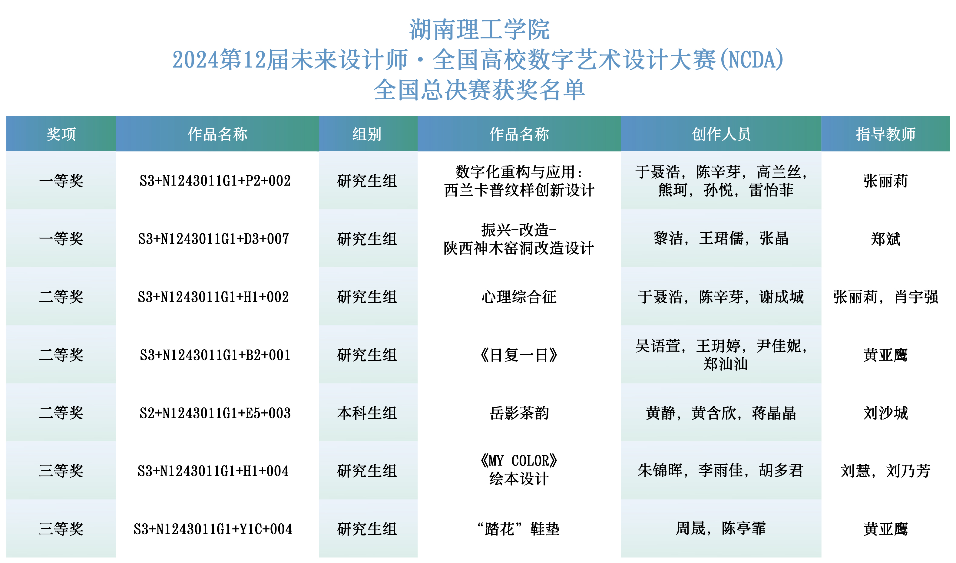 近日,第十二届未来设计师·全国高校数字艺术设计大赛(NCDA)获奖结果公布,公司师生在全国赛中成绩斐然,获得国赛一等奖2项、国赛二等奖3项、国赛三等奖3项,湖南赛区等级奖若干项。