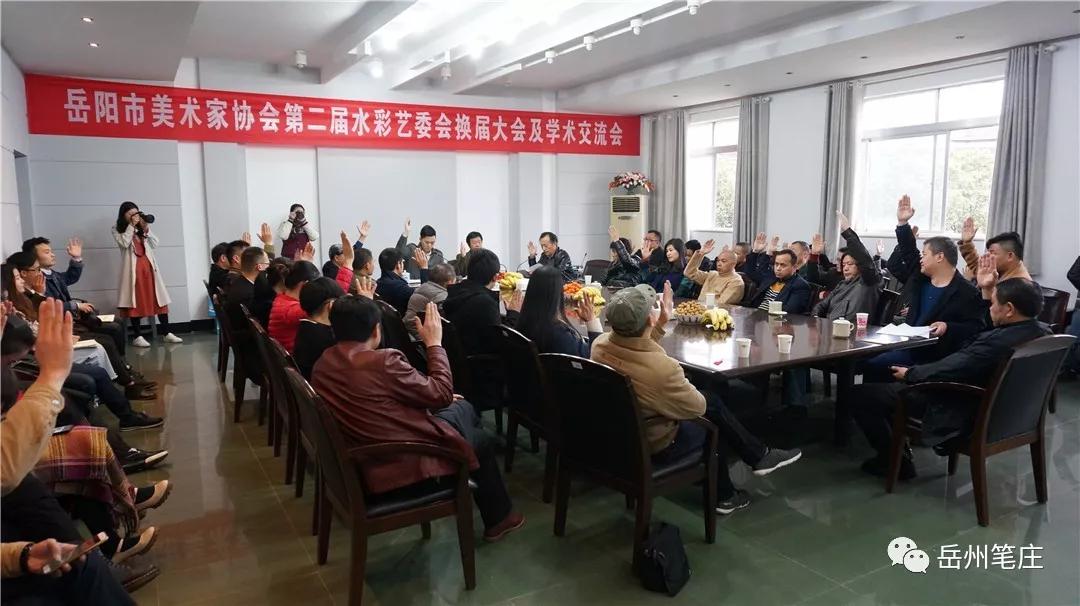 岳阳市美术家协会第二届水彩艺委会换届大会及2018年学术交流会于2018年3月17日上午在beats365官方网站会议室举行。出席会议的领导、嘉宾有市文联副主席、市美协主席李占卿、副主席戴剑、洪琪、李满枝、刘文良、王志平、主席团委员李军、张琼辉、余思慧、油画艺委会主任柳一川、市美协副秘书长谢共平、贺琪岚,特邀嘉宾有市文联副主席、市民间艺术家协会主席黄坚波教授,会议还有来自全市各县(市)区的水彩画家代表50余人。会议共分两个部分,第一部分是换届大会,由市文联委员、市美协主席团委员兼秘书长张琼辉主持,第二部分为2018年学术交流会,由第二届水彩艺委会学术秘书长邱黎主持。