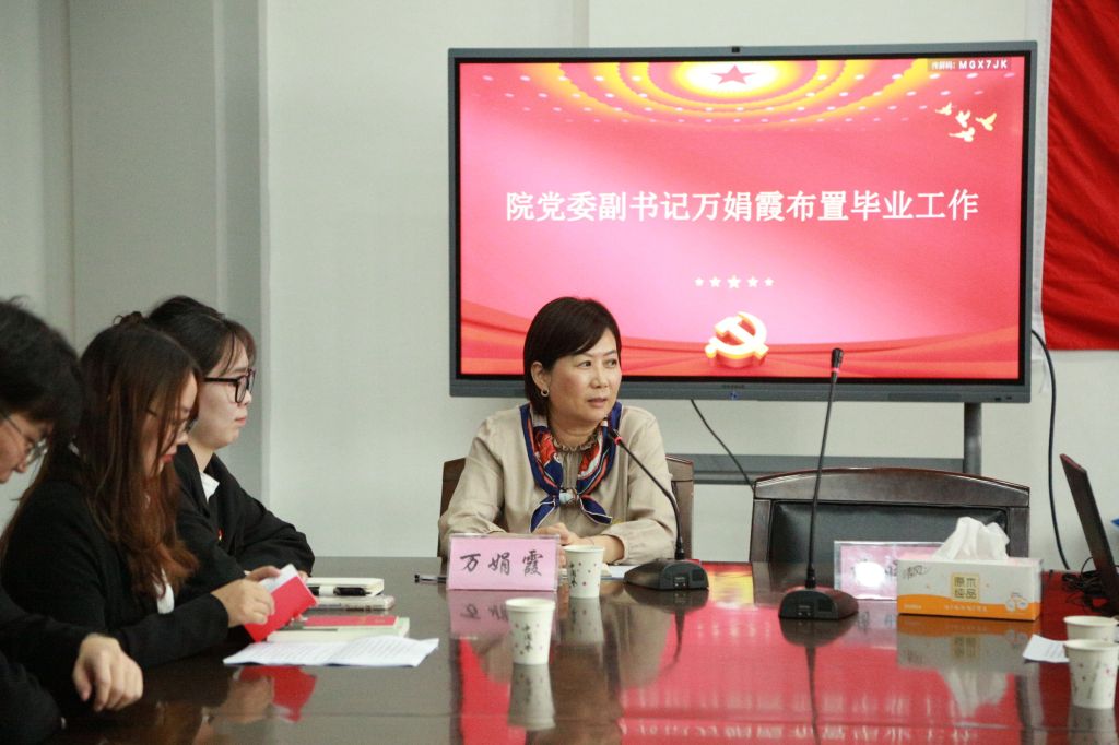 万娟霞副书记对即将踏上新征程的党员同志们提出殷切的期望,勉励他们要时刻不忘初心,牢记使命,不断增强党性修养,牢记党员身份。万书记对离校手续办理、党组织关系转接、毕业典礼、证书发放等重要毕业工作进行了详细的布置。