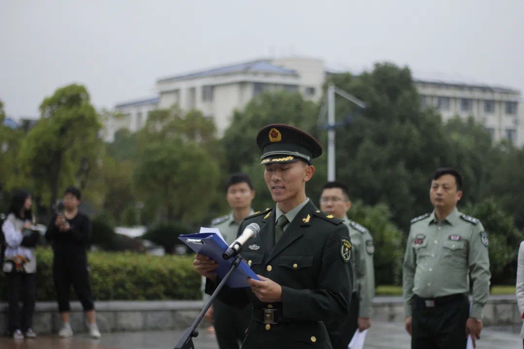 集团民兵连连长杨辰旭作为军训教官代表向新生们提出了两点倡议:一、学习军人作风,严格要求自己,服从命令,听从指挥,刻苦训练。二、发挥集体主义精神,团结协作,“不抛弃不放弃”,建立深厚的同学情。并祝愿同学们在军训中有所学、有所思、有所获。