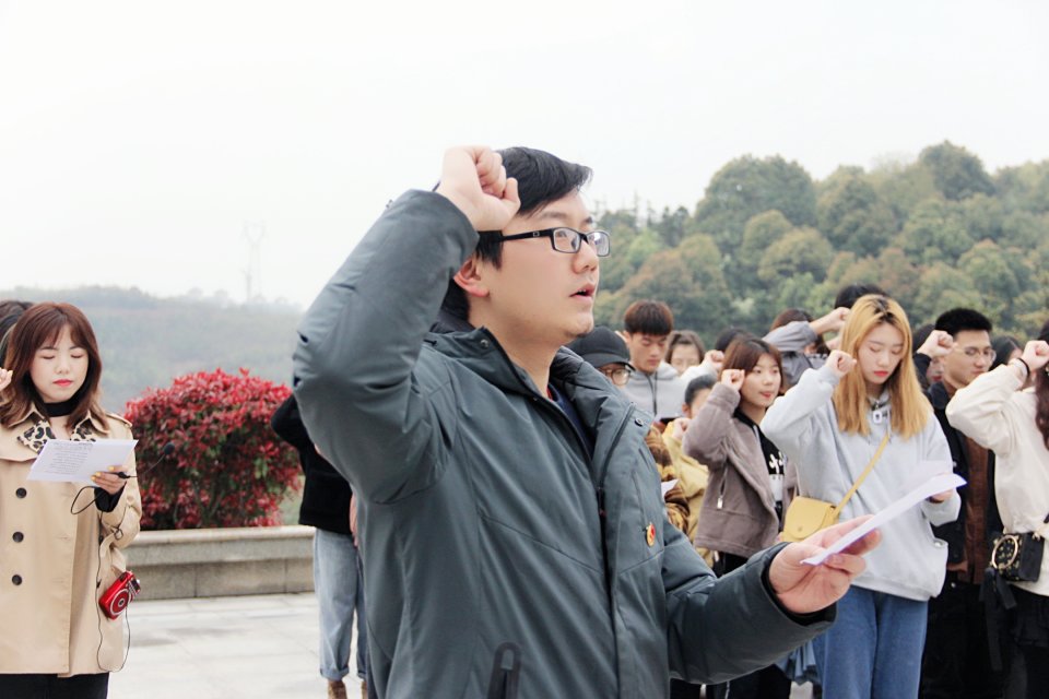 首先全体成员在人民英雄纪念碑下进行高唱团歌,团歌之后,在陈熹旺老师的带领下庄严宣誓,新团员进行入团宣誓,老团员重温入团誓词。紧接着,员工代表王雪影上台发言,“少年智则国智,少年富则国富,少年强则国强”一群意气奋发的青年用热血和生命谱写了一曲壮丽的青春之歌,绘就了一幅最宏伟的青春图画。然后,团总支书记陈熹旺讲话,阐述自己对革命先驱的缅怀之情,以及教导我们不忘初心、缅怀先烈,好好学习全面发展自己,为祖国的发展贡献自己的力量,肩负起时代赋予我们的使命。最后,美院代表向所有革命中牺牲的烈士们献花篮,全体成员向烈士们鞠躬并默哀一分钟,随后将自己所想要表达的话放入纸箱中,全体成员低头表达心中那份对革命先烈们的沉重情感,以示对先烈们的缅怀和敬意。