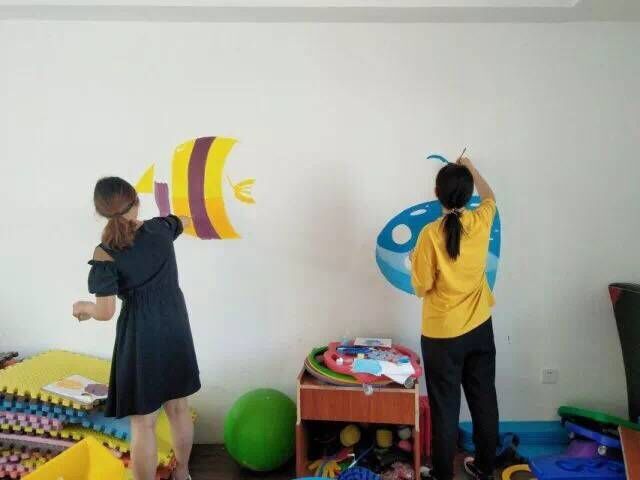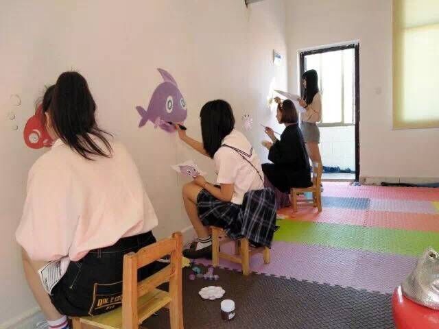志愿者们早早地来到关爱中心后,就快速地投入到墙绘制作工作中。通过分组合作,分别来到几面需要绘制的墙面开始作画。