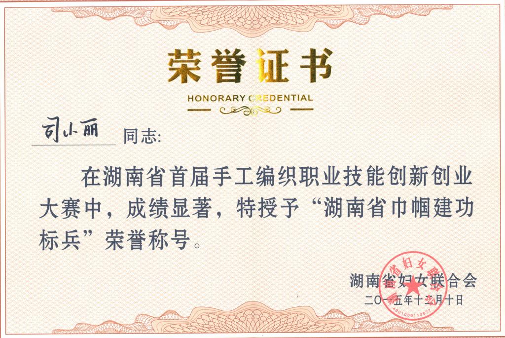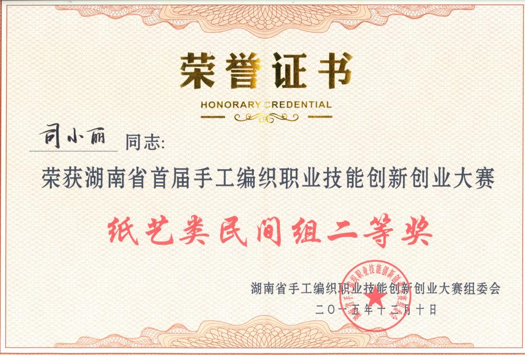 1.项目的主创人司小丽来自于甘肃,从小就喜欢传统民间艺术,因为上学期间的一次偶然机会,她与剪纸结下了不解情缘,因为热爱她选择了坚持,通过自身的努力,作为公认的传统 手工艺传承人,取得过多项好成绩,先后获 得湖南省首届手工编织职业技能创新创业大 赛纸艺类民间组二等奖,荣获南省技术能 手、“湖南省青年岗位能手”、“湖南省巾 帼建功标兵”、“优秀传统手工技艺传习 者”等荣誉称号。她可以充分带动 团队成员的技术培养,以过硬的精湛技艺独 树一帜。