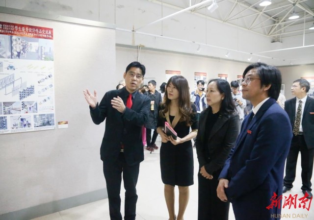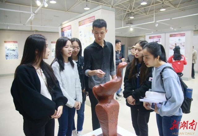 开幕式后,设计艺术作品交流闪亮登场。展览共展出了中韩两所大学68件员工作品,涵盖了空间设计、景观设计、室内设计、雕塑等,这些作品呈现出的不同设计思想和设计理念,很好地将设计元素和前沿时尚结合在一起,全方位展示了中韩两校设计艺术创新与应用服务方面所做出的探索和取得的成果。韩国湖西大学参展员工代表崔灿、赵海云、朴秀贤、赵佳燕也来到了现场,与beats365官方网站师生亲切交流。朴秀贤高兴地说:“我是第一次来中国,岳阳南湖很美,人很友好。这次活动不仅增进了友谊,还让不同的观点相互碰撞交融,将为自己以后的艺术创作带来帮助。”